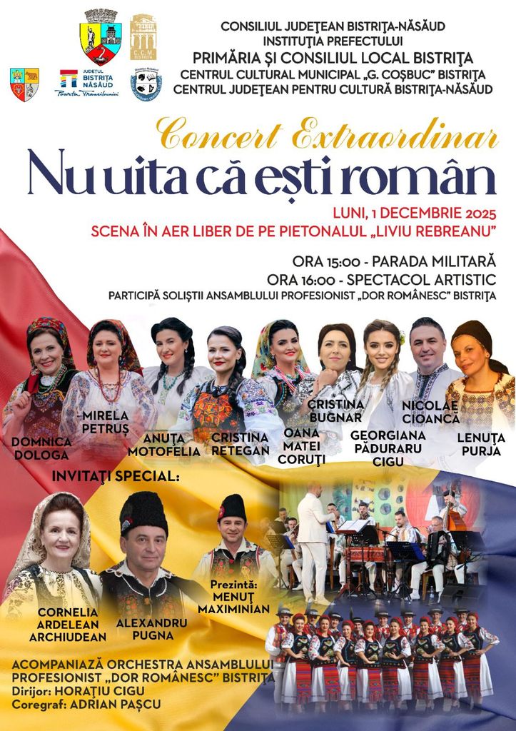 Concert în centrul istoric al Bistriței cu Ansamblul „Dor Românesc” și invitați speciali